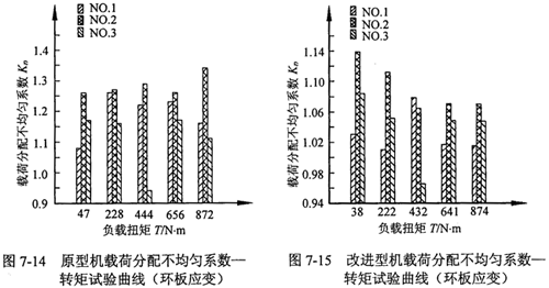 對兩級三環(huán)減速器的原型機(jī)和改進(jìn)型機(jī)的環(huán)板齒根彎曲應(yīng)力和環(huán)板薄弱部位的應(yīng)力進(jìn)行了測試,并討論了載荷均衡情況。結(jié)果表明:改進(jìn)型機(jī)具有很好的均載效果,載荷分配不均勻系數(shù)由均載前的1.33降為均載后的1.07。這個數(shù)值較基本型三環(huán)減速器的載荷分配不均勻系數(shù)1.7小的多。